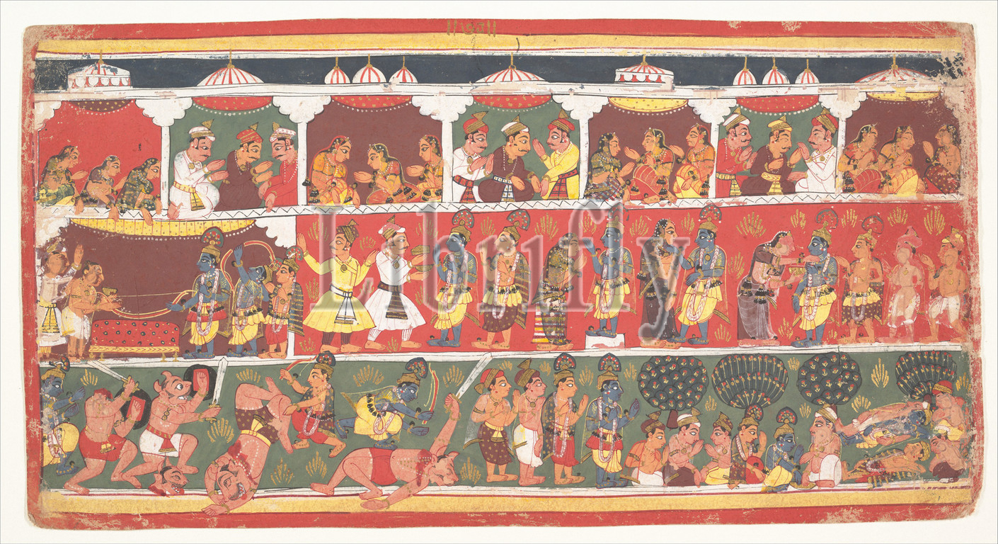 Encounters, Mathura, Page, Dispersed Bhagavata Purana, Ancient Stories, Lord Vishnu, ca, 1700, India, Madhya Pradesh, Malwa, Ink, opaque watercolor, paper, 7 9/16 x 14 3/16, 19.2 36 cm, Paintings, triple-register scene, nobility, Mathura watch, Krishna, Balarama participate, bow sacrifice, heroic deeds, Bhagavata