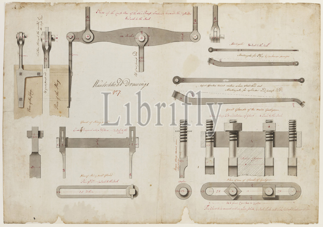 Engineering Drawing - James Watt, Detail of Components for Wanlockhead Engine, Sheet No.7, 1785, Hand-coloured ink and watercolour drawing showing elevations, cross-sections and plan views of several key components of an atmospheric condensing beam pumping engine designed by James Watt and supplied by the firm Bolton & Watt, of Birmingham, to the Margaret Mine, at Wanlockhead, Scotland, in 1785-86. Scale: 1/4 inch to 1 inch. Undated, but likely 1785. The drawing is part of a set of technical