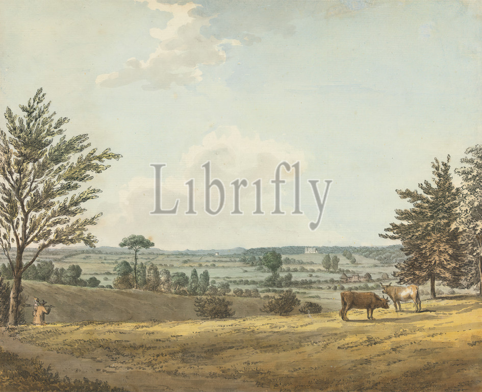 Englefield House, Berkshire, Samuel Hieronymus Grimm, 1733–1794, Swiss, Watercolor, pen, brown ink, graphite, medium, moderately textured, cream laid paper, Sheet, buildings, cattle, men, trees, Berkshire