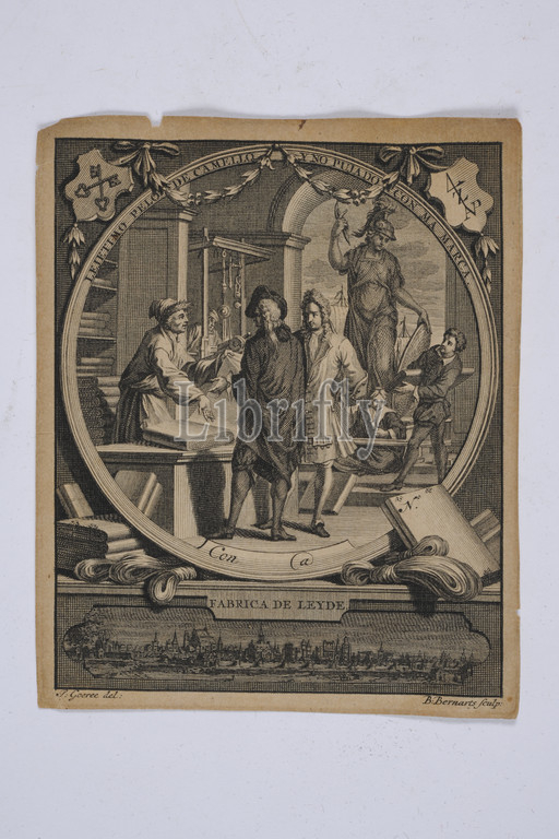 engraving, between 1750-1800, Signature front, bottom left: J. Goeree del :, front, bottom right: B. Berbarts sculp :, ink, paper, printed, General: 13.4 x 10.8cm 134 x 108mm, factory print with the scene of a cloth shop, with a large statue of Minerva on the right. Several men are standing at a counter in the store. Around this is the circular LEJETIMO PELO CAMELIO YNO PUJADO CON MA MARCA and Con @. In the top left corner is a shield with the coat of arms of Leiden and in the top right corner is a shield with the factory mark with a monogram of the letters LZAP. In the bottom left and bottom right corners, sheets and sajet strands are depicted, below which it reads: FABRICA DE LEYDE. Below in a rectangular medallion is a city view of Leiden. Signed at the bottom. On the back is written at the bottom right also by mr van Dam, minerva, shop, cityscape, man