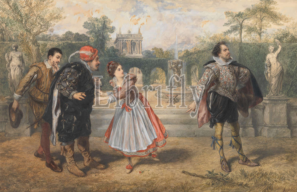 Enter Malvolio, Crossgartered..., Sir John Gilbert, 1817–1897, British, 1863, Watercolor, pen, black ink, brown ink, gray ink, red ink, gouache, gum arabic, graphite, thick, slightly textured, beige wove paper, Sheet, apron, arches, belt, boots, breeches, capes, columns, countess, cross-dressing, doublet, dress, feather, flower, plant, fountain, garden, gesture, hats, hedges, literary theme, love, men, palace, pendant, play, plays, William Shakespeare, railing, ring, shoes, statues, steps, steward, stockings, stool, surprise, sword, trees, Twelfth Night, Act III, Scene IV, Twelfth Night, You Will, play, William Shakespeare, woman, Europe, Illyria