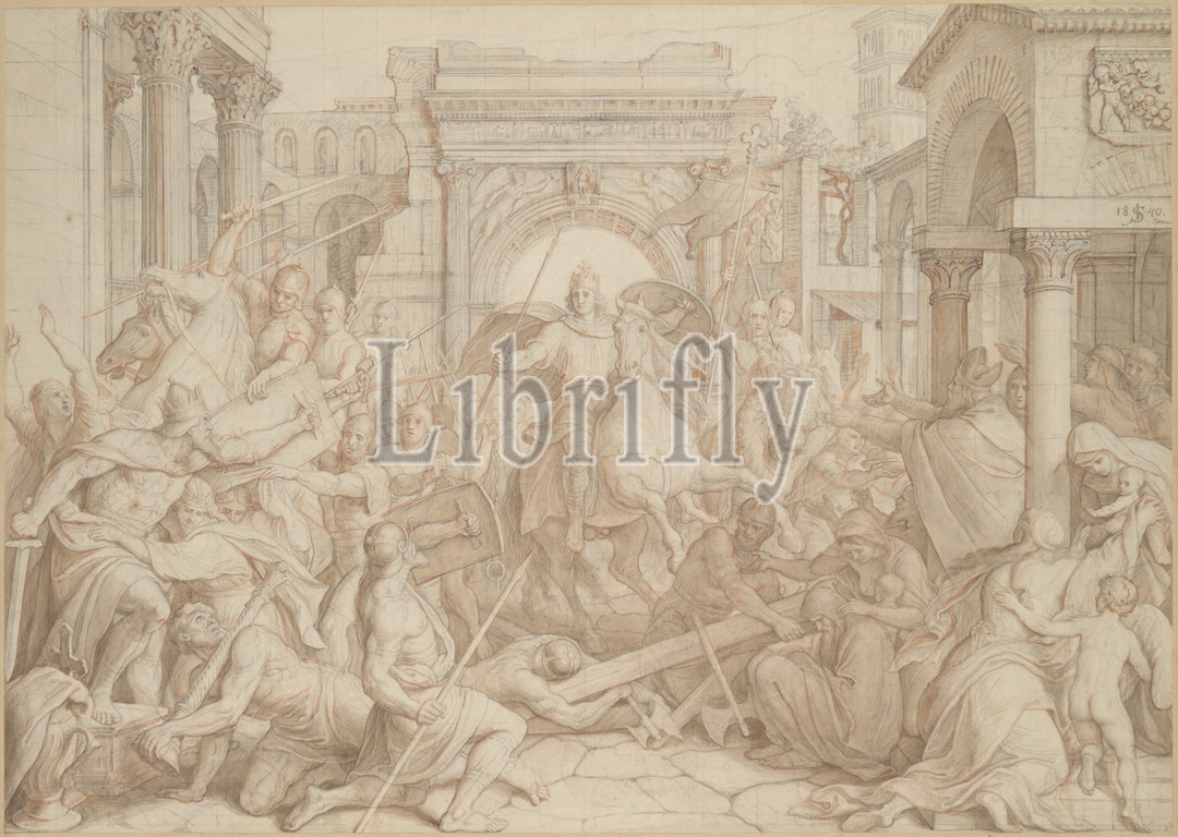 Entrance, Charlemagne, Pavia, 1840, Black chalk, graphite, brown watercolor washes, red chalk, Squared, transfer, numerical indications, vertical divisions, lower edge, sheet, 18 1/4 x 25 3/4, 46.3 65.4 cm, Drawings, Julius Schnorr von Carolsfeld, German, Leipzig, 1794–1872, Dresden, Schnorr von, Carolsfeld, leading member, Nazarenes, group, Northern artists, favored biblical, erudite literary, themes, adopted, clear, linear manner, reminiscent, Renaissance idols