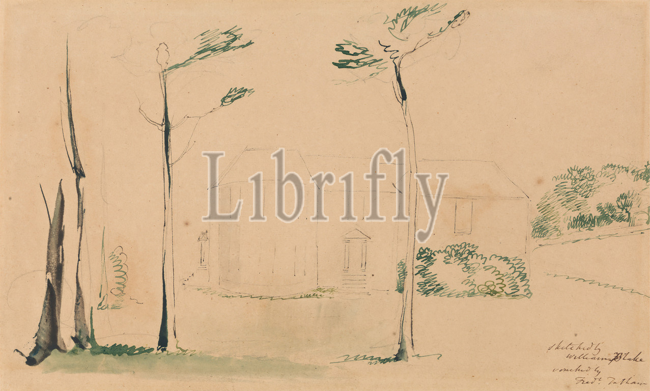 Entrance Front, Hayley's House, Eartham, William Blake, 1757–1827, British, 1801, Pen, black ink, watercolor, graphite, medium, smooth, beige wove paper, Sheet, architectural subject, branches, bushes, house, landscape, leaf, shrubs, trees, Chichester, Eartham, England, Europe, United Kingdom, West Sussex