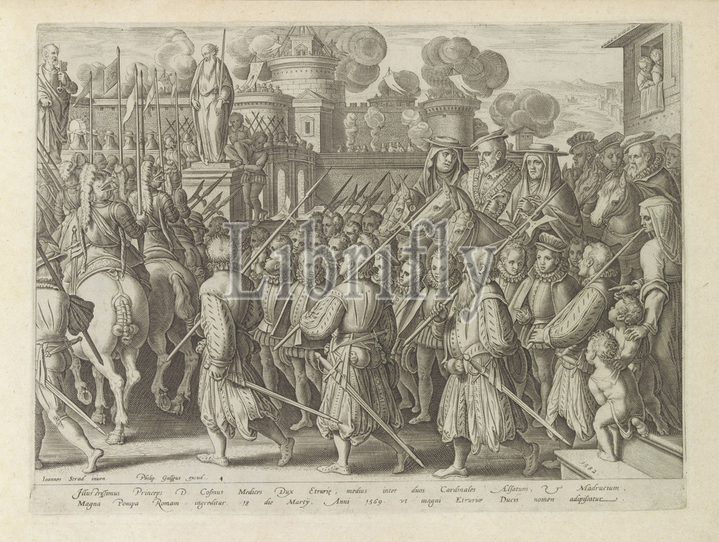 Entry, Cosimo I, Rome, 1569 Family history, genus Medici, part 3, series title, Mediceae Familiae rerum feliciter gestarum victoriae, triumphi, procession, soldiers central Cosimo I de 'Medici, horseback, procession goes via, Angel Bridge towards Angel Castle, coronation, first Grand Duke, Tuscany, bottom margin two lines, text, Latin, Numbered, pen 1, print, part, album, Angel Castle, Angel Bridge, genus de'Medici, Cosimo I de'Medici, Philips Galle, 1582, 1583, paper, engraving