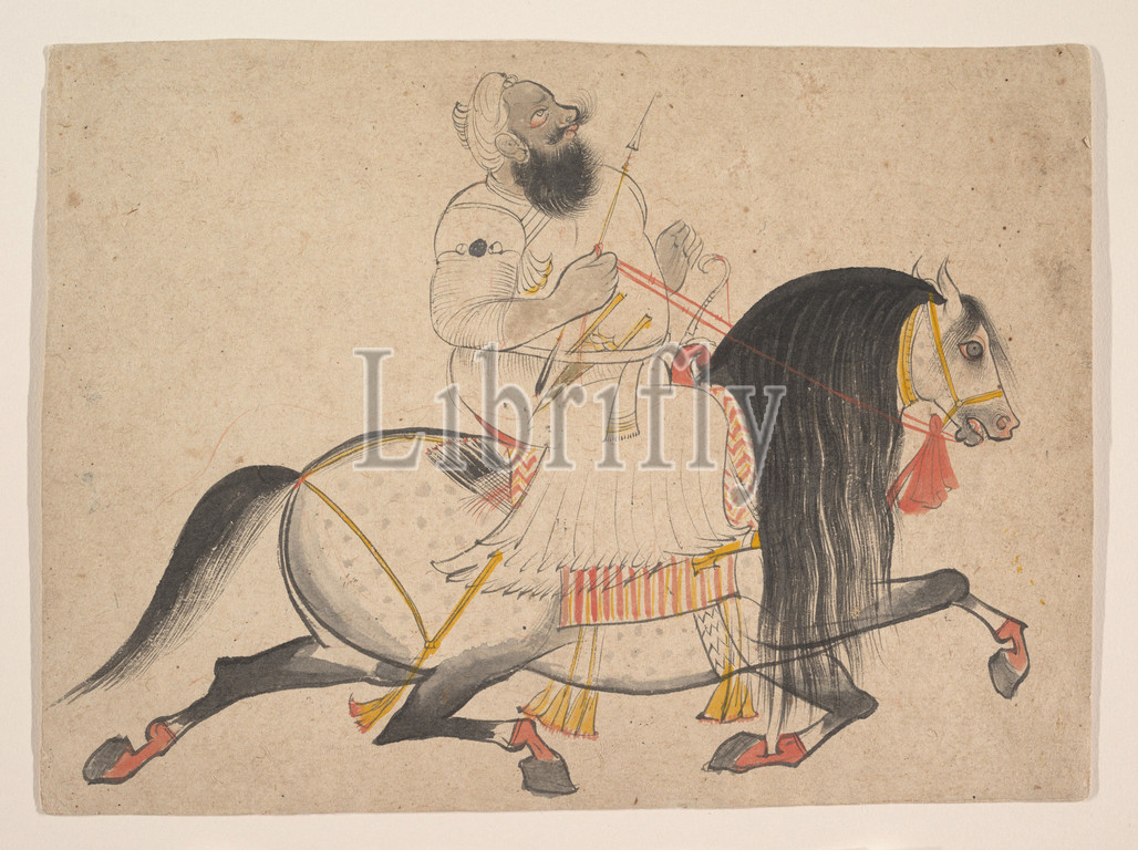 Equestrian Portrait, Noble, ca, 1775, India, Rajasthan, Devgarh, Ink, opaque watercolor, paper, 8 11/16 x 12, 22 30.5 cm, Paintings, Attributed to Bakhta, Rajput paintings, jewel, minute details, labored finish, drawing, swift, expressive, varied artist, line, whether, suggesting, bulge, muscular forearm, taut belly, horse, wiry bristle mustache