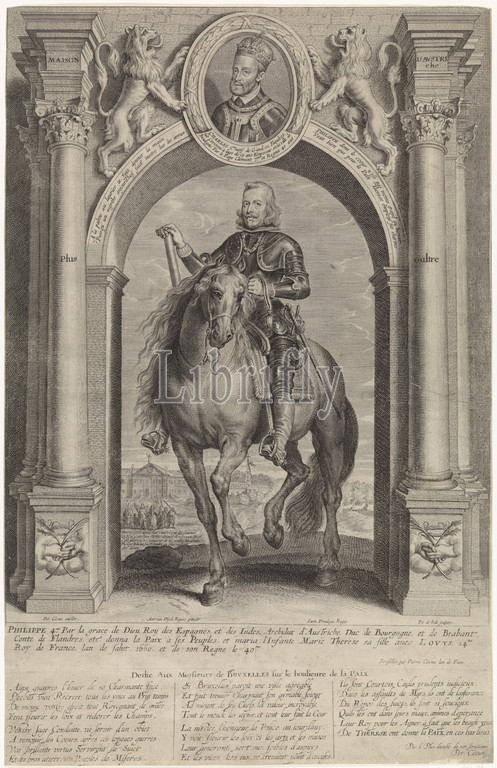 Equestrian portrait of Philip IV, king of Spain, under the triumphal arch Maison d'Avstriche (title on object), in armor. He carries a chain with the Order of the Golden Fleece. He is holding a command staff in his right hand. It is under a triumphal arch. On the arc the portrait of Charles V, in armor and with a chain with the Order of the Golden Fleece. The portrait is set in an oval frame with a three-line caption in Latin and is flanked by two lions. In the background a view of a city and a procession and below that a five-line caption in French. In the margin a three-line caption in Latin. Below the print is a poem in French, printed in three columns, from a separate plate., Triumphal arch, knighthood order of the Golden Fleece, horse, armor, Philip IV (king of Spain), Charles V of Habsburg (German emperor and King of Spain), Pieter de Jode (II) (mentioned on object), Antwerp, 1628 - 1670, paper, engraving, h 497 mm × w 320 mm