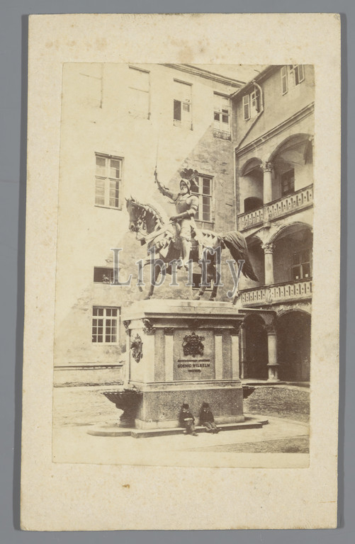 Equestrian statue, Duke Everhard I, Württemberg, Ludwig Hofer, courtyard, Altes Schloss, Stuttgart, Germany, Stuttgart, equestrian statue, King Wilhelm, anonymous, Johann Ludwig von Hofer, Stuttgart, 1859, 1885, paper, cardboard, albumen print, height 102 mm, width 62 mm