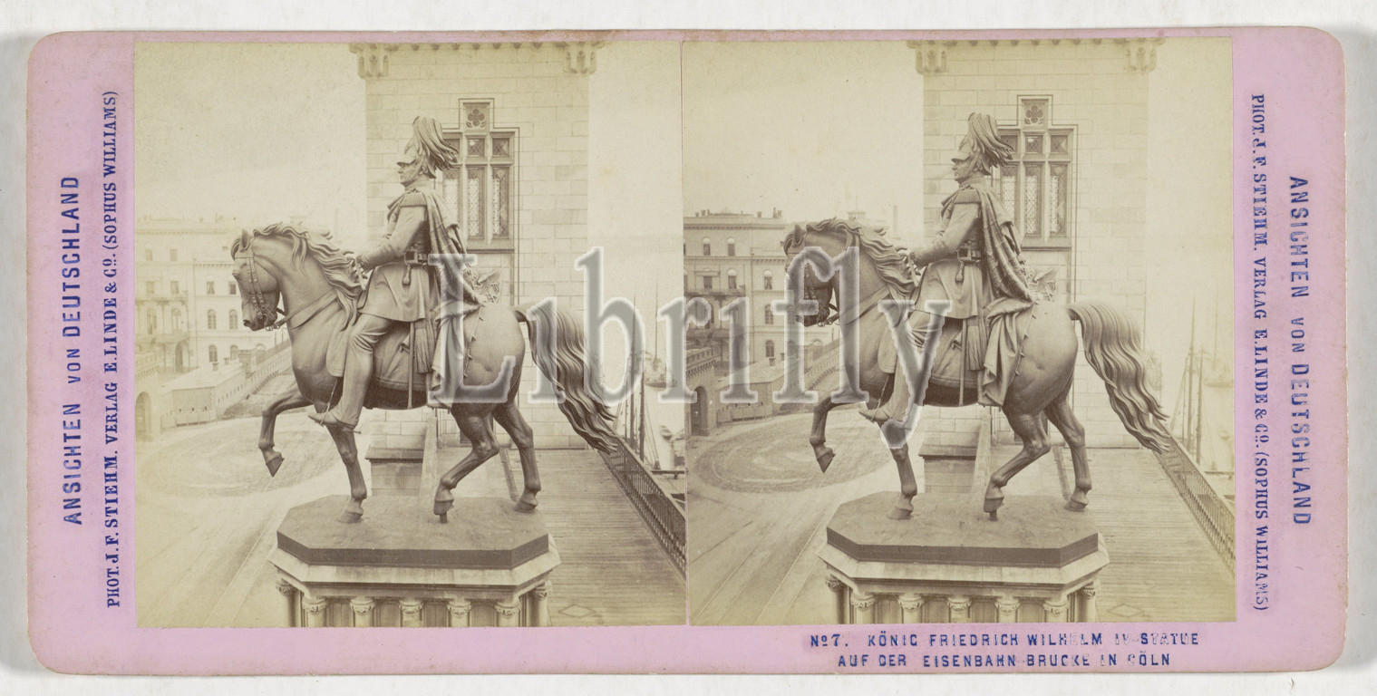 Equestrian statue, King Frederick William IV, railroad bridge, Cologne, König Friedrich Wilhelm IV-Statue auf der Eisenbahn Brücke, Cöln, Ansichten von Deutschland, series title, Johann Friedrich Stiehm, mentioned, Gustav Bläser, Cologne, publisher, Berlin, 1867, 1871, cardboard, paper, albumen print, height 86 mm, width 177 mm