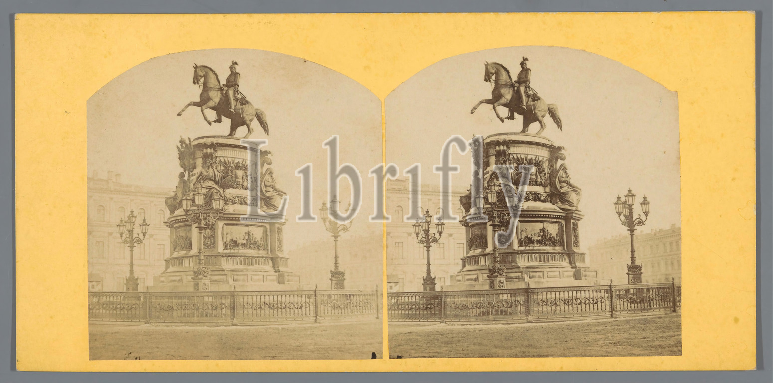 Equestrian statue of King Nicholas I of Russia in St. Petersburg, St. PETERSBOURG (title on object), equestrian statue, Isaac Square, anonymous, Izaäkplein, c. 1850 - c. 1880, cardboard, photographic paper, albumen print, h 85 mm × w 170 mm