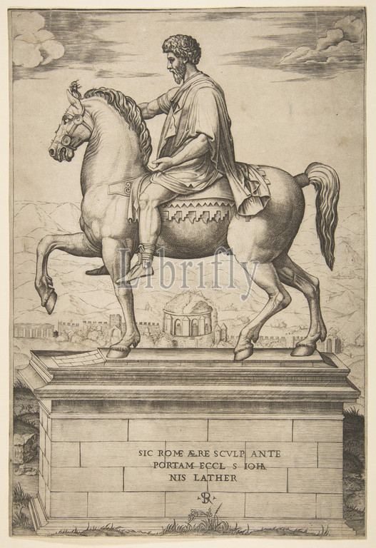 Equestrian Statue, Marcus Aurelius, 1515–27, Engraving, 13 3/8 x 9 1/8, 33.9 23.1 cm, Prints, Marco Dente, Italian, Ravenna, active by, 1515–died, 1527, Rome