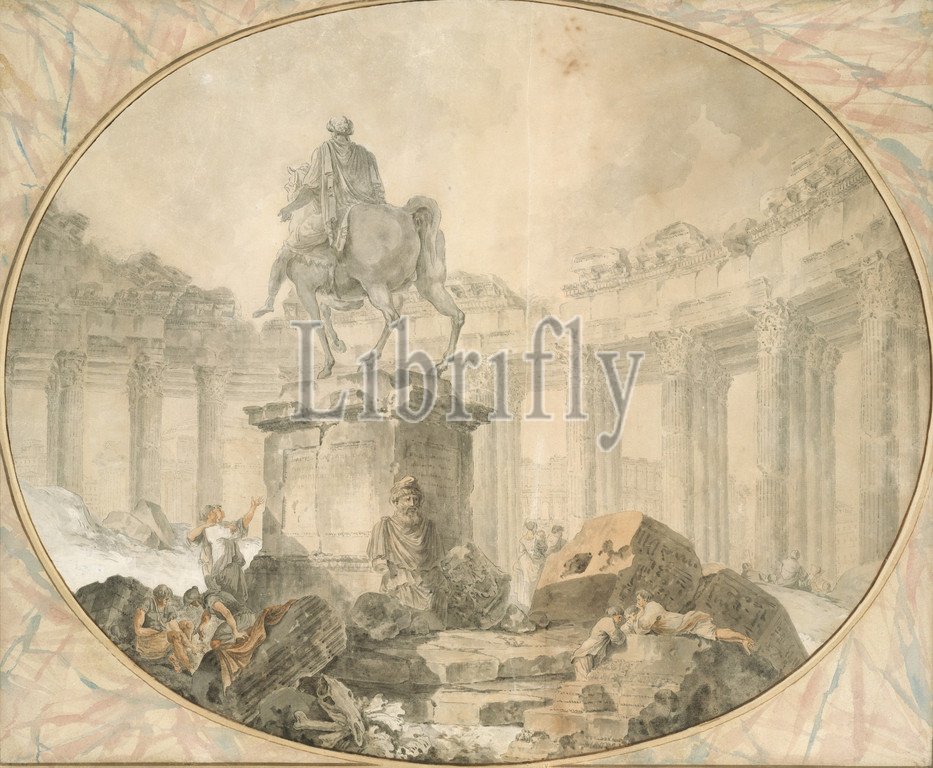 Equestrian Statue of Marcus Aurelius, 1757, Pen and black ink, brush and gray and brown wash, pale rose watercolor and white heightening over black chalk., 19 1/16 x 23 1/8 in. (48.4 x 58.8 cm), Drawings, Hubert Robert (French, Paris 1733–1808 Paris), The painter and draftsman Hubert Robert, who spent eleven years in Rome (1754-65) studying at the French Academy, is known for his picturesque capriccios - views of the city combining real and imaginary ancient monuments