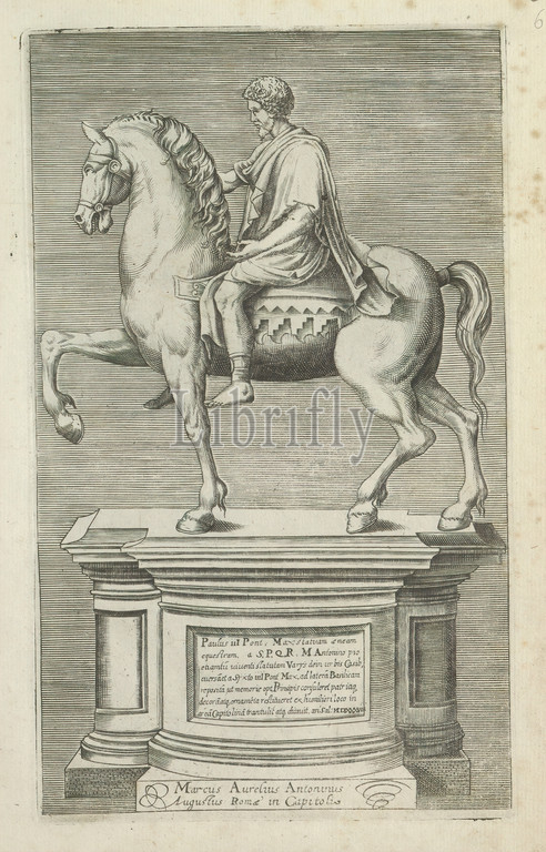 Equestrian statue, Marcus Aurelius, Antique sculptures, Rome, series title, Antiquarum statuarum urbis Romae quae, publicis locis visuntur icones, series title, equestrian statue, Marcus Aurelius, Piazza del Campidoglio, Rome, Caption, Latin, Print, part, album, print maker, anonymous, publisher, Andrea Vaccari, print maker, Italy, publisher, Rome, 1584, paper, engraving, height 224 mm × width 144 mm