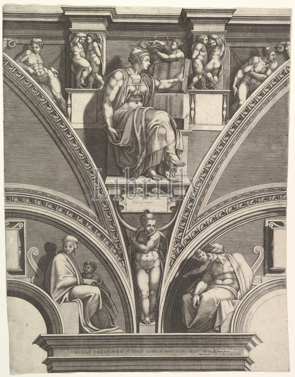 Eritrean Sibyl, series, Prophets, Sibyls, Sistine Chapel, 1570–75, Engraving, sheet, 21 3/4 x 16 15/16, 55.3 43 cm, borderline, Prints, Engraved by Giorgio Ghisi, Italian, Mantua ca., 1520–1582, Mantua, After Michelangelo Buonarroti, Caprese, 1475–1564, Rome