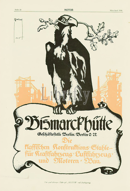 Ernst Dryden, Bismarckhütte, paper, offset printing, signed, dated, recto top left, drawing, Deutsch 1915, advertisements, product, business advertising, prints, eagle, birds, acorn, oak, iron, steel industry