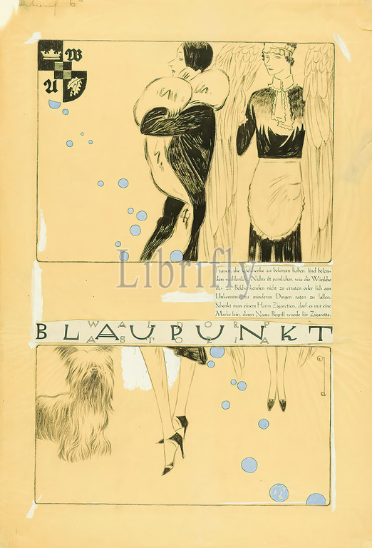 Ernst Dryden, Blaupunkt, Pergamin, drawing charcoal, ink, opaque watercolor, gouache, collage, gouache over charcoal, black ink, total: height: 58.8 cm; width: 39.9 cm, monogrammed: recto right in drawing: d, inscribed: recto top left: Draft 6a, advertisements, product and business advertising (print graphics), woman