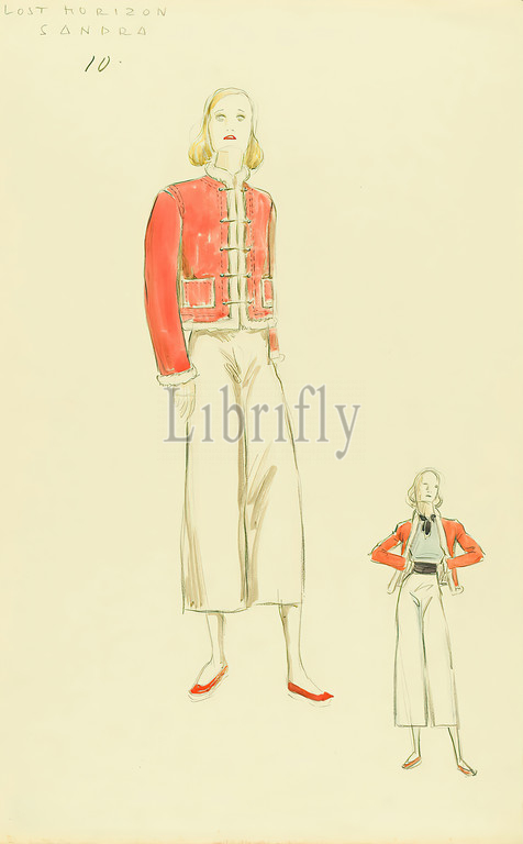 Ernst Dryden, costume, Jane Wyatt, film Lost Horizon, paper, non-opaque watercolor, pencil, watercolor, drawing, watercolor, lead, inscribed, recto upper left, LOST HORIZON SANDRA 10th, illustrations, pants