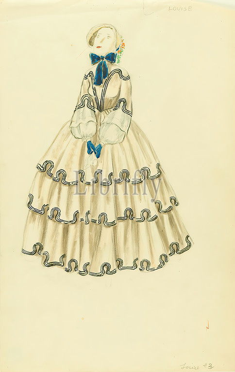 Ernst Dryden, costume for the movie The King Steps Out, paper, non-opaque watercolor, pencil, watercolor, drawing, watercolor over lead, Total: Height: 48,4 cm; Width: 30,6 cm, inscribed: recto top right: LOUISE, inscribed: recto bottom right: Louise #3, illustrations, dress, fashion, clothing, women's fashion, theater costume