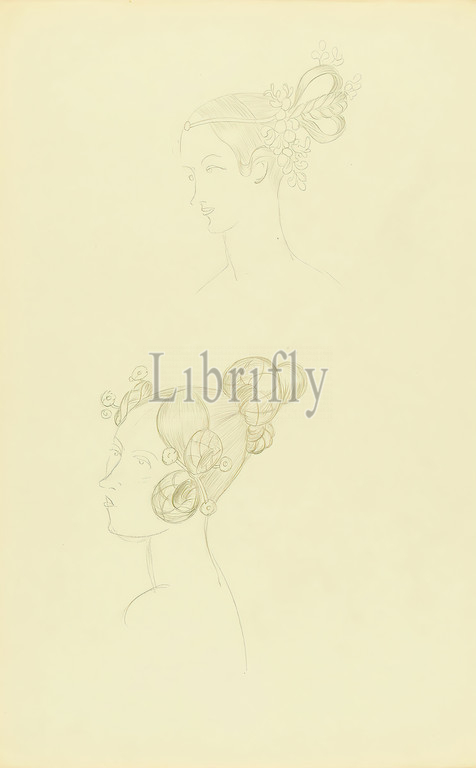 Ernst Dryden, Draft, women's hairstyles, movie Tom Sawyer, paper, pencil, drawing, pencil drawing, drawing, graphics, costume design, design drawings, fashion, head, face, women's fashion, hairstyle, hair fashion, hairstyle, cinematography