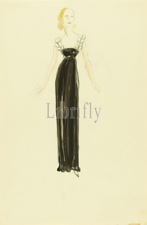 Ernst Dryden, Lady in black evening gown, paper, Non-covering watercolor, pencil, watercolor, drawing, watercolor over pencil, Total: Height: 45.8 cm; Width: 30.6 cm, drawing, graphics, illustrations, fashion, clothing, women's fashion, dress