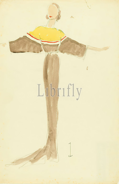 Ernst Dryden, Lady, brown dress, paper, watercolor, pencil, watercolor, drawing, watercolor, pencil, monogrammed, recto bottom right, drawing, graphics, illustrations, fashion, clothing, women's fashion, dress