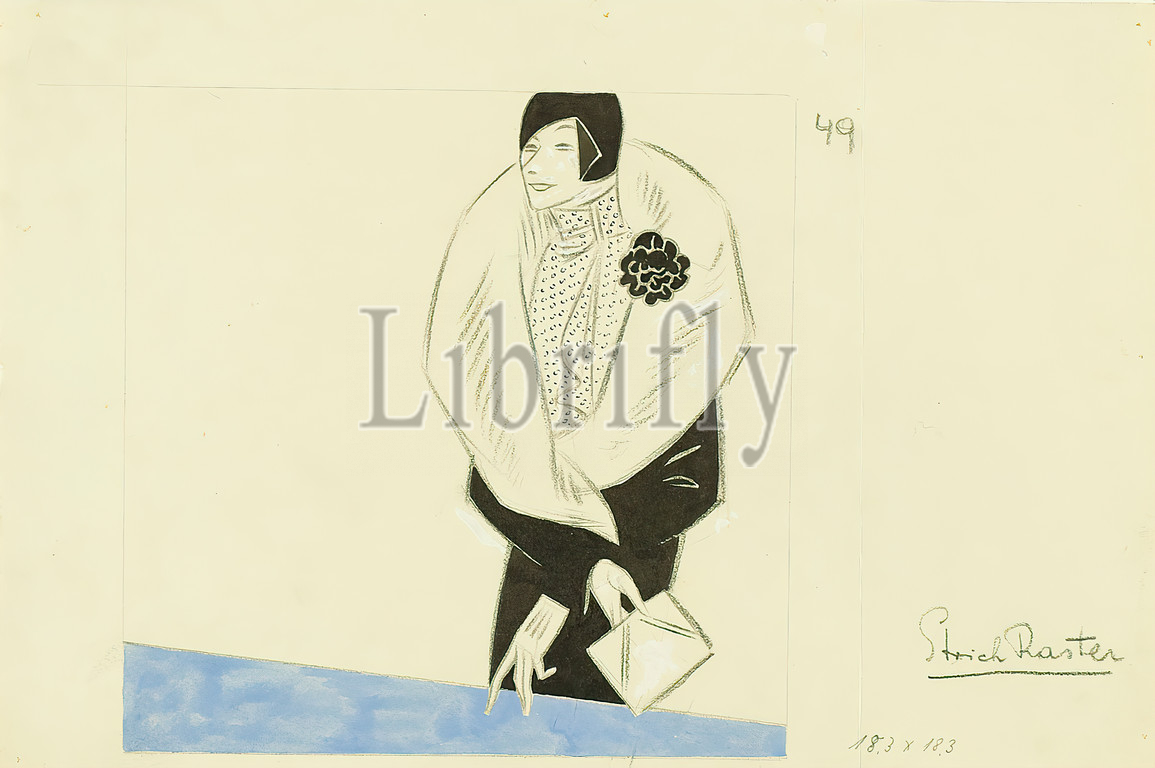 Ernst Dryden, lady, counter, cardboard, graphite pen, ink, opaque white, opaque watercolor, drawing, graphite drawing, black ink, opaque white, blue gouache color, numbered, recto top right, bottom right, line grid 18.3 x 18.3, illustrations, drawing, graphics, fashion, clothing, woman