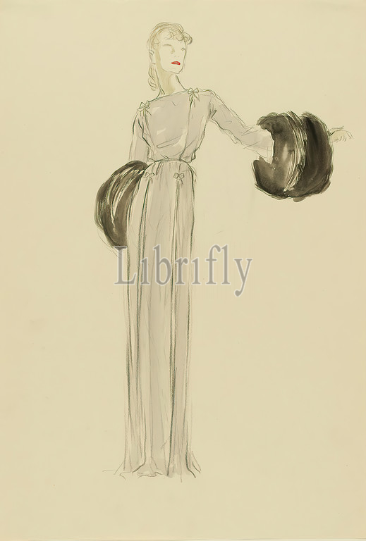 Ernst Dryden, Lady in grey evening gown, paper, Non-covering watercolor, pencil, watercolor, drawing, watercolor over lead, Total: Height: 44.2 cm; Width: 30.8 cm, illustrations, dress, fashion, clothing, women's fashion, accessories, accessories of clothing