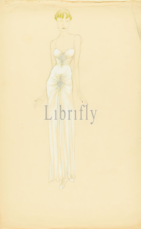 Ernst Dryden, Lady in white evening dress, paper, Non-covering watercolor, pencil, watercolor, drawing, watercolor over lead, Total: Height: 52 cm; Width: 33 cm, illustrations, dress, fashion, clothing, women's fashion