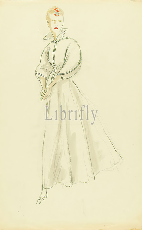 Ernst Dryden, Lady in white evening gown, paper, Non-covering watercolor, pencil, watercolor, drawing, watercolor over pencil, Total: Height: 48.6 cm; Width: 30.7 cm, drawing, graphics, illustrations, fashion, clothing, women's fashion, dress