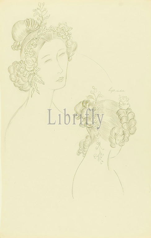 Ernst Dryden, sketch, women's hairstyles, film Tom Sawyer, paper, pencil, drawing, pencil drawing, recto right, Left side, illustrations, drawing, graphics, costume design, sketch drawings, fashion, women's fashion, hairstyle, hair curl, tuft