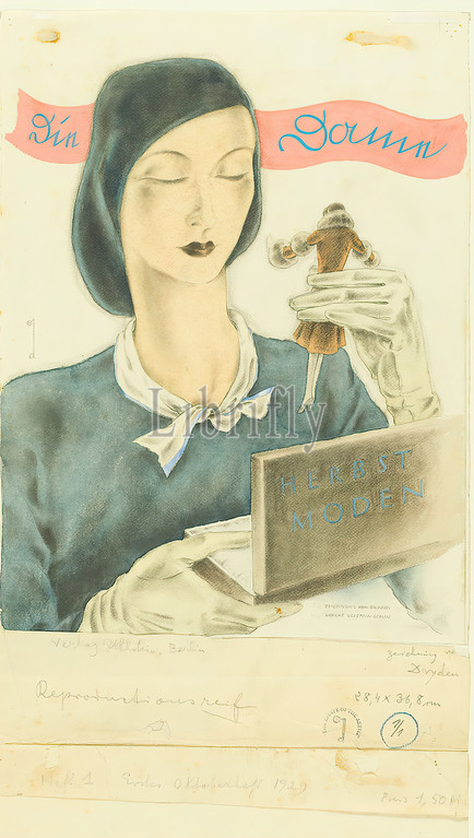 Ernst Dryden, title page design for Die Dame Herbstmoden, cardboard, opaque watercolor, pencil, gouache, gouache over lead, Total: height: 54.5 cm; width: 31.2 cm, monogrammed and inscribed: recto in the drawing: left: d and u. right: ZEICHNUNG VON DRYDEN VERLAG ULLSTEIN BERLIN, inscribed: recto below: in pencil: Verlag Ullstein, Berlin, Zeichnung von Dryden, ready for reproduction, 28,4 x 36,8 cm, 1/1, Heft 1 Erstes Oktoberheft 1929, price 1,50 m, stamp: recto below: THE ESTATE OF THE ARTIST, newspapers, magazines, design drawings, drawing, graphics, woman, fashion, clothing, model, mannequin