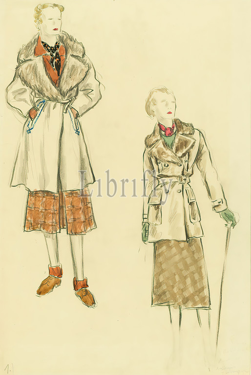 Ernst Dryden, Two ladies in winter clothes, paper, Non-covering watercolor, watercolor, drawing, watercolor over lead, Total: Height: 45.8 cm; Width: 30.4 cm, numbered: bottom left: 1.), illustrations, fashion, fashion, clothing, women's fashion, jacket, coat, cape, cape, winter