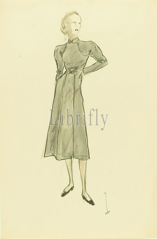 Ernst Dryden, Woman in grey dress, paper, pencil, Non-covering watercolor, watercolor, drawing, watercolor over lead, Total: Height: 45.8 cm; Width: 30.6 cm, monogrammed: recto lower right: d, fashion and textile design, drawing, graphics, design drawings, illustrations, fashion, clothing, women's fashion, dress