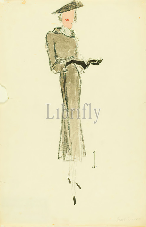 Ernst Dryden, woman, grey winter dress, paper, non-opaque watercolor, pencil, watercolor, drawing, watercolor, pencil, monogrammed, recto bottom right, inscribed, recto bottom right, Black Velvet, drawing, graphics, illustrations, fashion, clothing, women's fashion, dress, accessories, accessories, clothing
