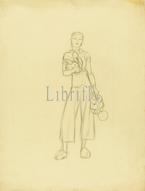 Ernst Dryden, woman, rabbit, paper, pencil, drawing, pencil drawing, fashion, clothing, women's fashion, pants, rabbit, garden tools