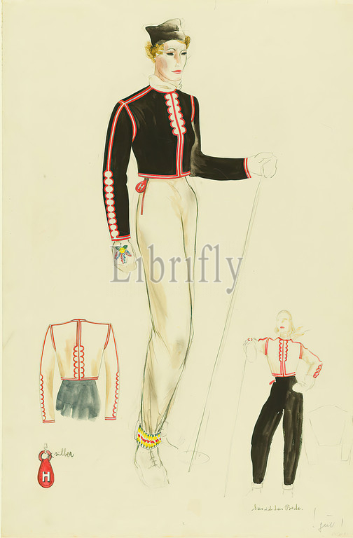 Ernst Dryden, woman, ski suit, paper, pencil, non-opaque watercolor, watercolor, drawing, watercolor, lead, inscribed, recto, bottom, drawing, pencil, silver, 's, best, good, illustrations, fashion, fashion, clothing