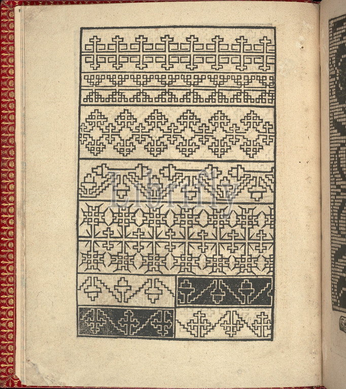 Ce est ung tractat de la noble art de leguille ascavoir ouvraiges de spaigne... page 3 (recto), after 1527, Woodcut, Overall: 6 7/8 x 5 11/16 in. (17.5 x 14.5 cm), Printed by Willem Vosterman. From top to bottom, and left to right: Design composed of 5 horizontal registers. First register is decorated with a curving vine of an alternating pattern of 2 different types of flowers