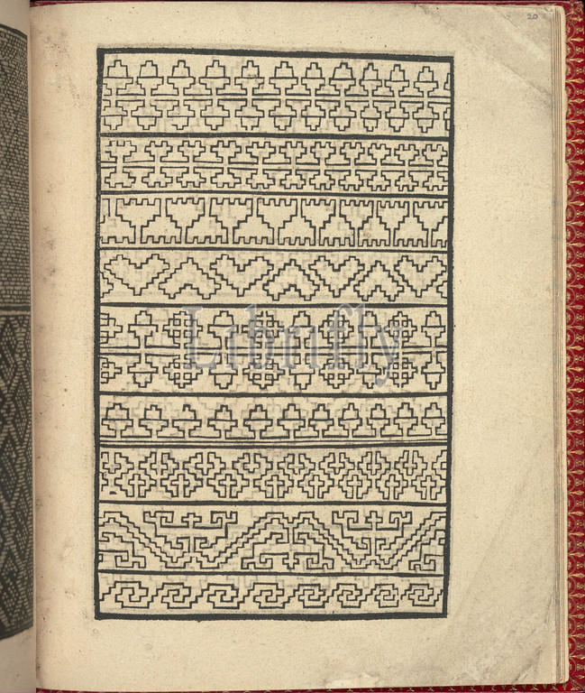Ce est ung tractat de la noble art leguille ascavoir ouvraiges s, page 20, recto, 1527, Woodcut, Overall, 6 7/8 x 5 11/16, 17.5 14.5 cm, Printed, Willem Vosterman, top, bottom, left, right, Design composed, 9 horizontal registers, register, decorated, different geometric, liner pattern