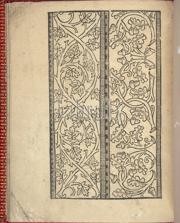 Ce est ung tractat de la noble art leguille ascavoir ouvraiges s, page 23, verso, 1527, Woodcut, Overall, 6 7/8 x 5 11/16, 17.5 14.5 cm, Printed, Willem Vosterman, top, bottom, left, right, Design composed, 2 vertical columns, Left column, decorated, intertwining, branches, leaves, Right, coiling branches, acorns, tied together, pairs, horizontal bands