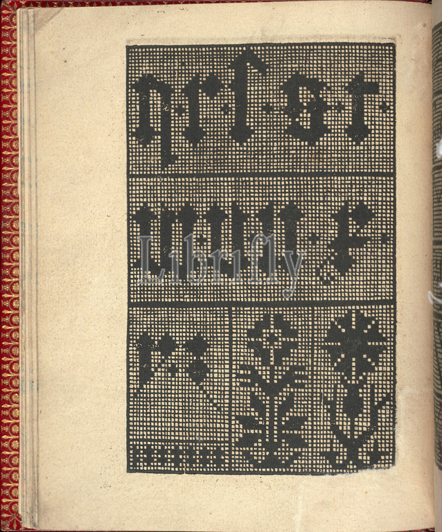 Ce est ung tractat de la noble art leguille ascavoir ouvraiges s, page 7, verso, 1527, Woodcut, Overall, 6 7/8 x 5 11/16, 17.5 14.5 cm, Printed, Willem Vosterman, top, bottom, left, right, Design composed, 3 horizontal registers, Top register, decorated, interlace pattern, Middle, pattern, diamonds, frame, 4-petaled flower, center