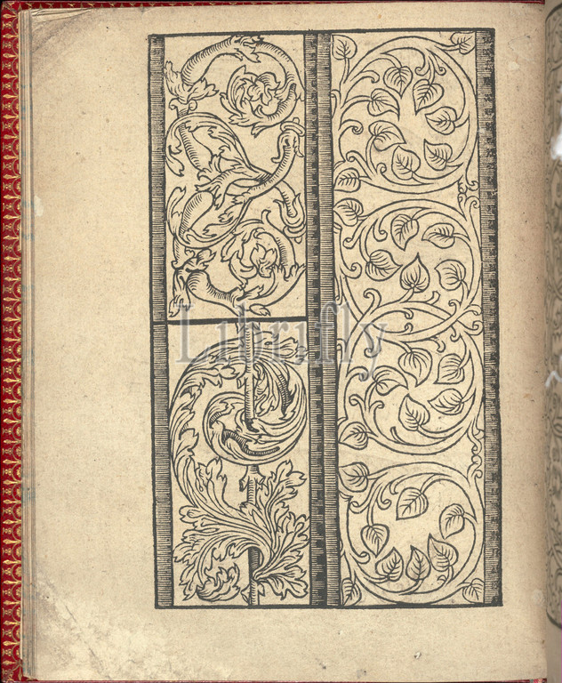 Ce est ung tractat de la noble art leguille ascavoir ouvraiges s, page 22, verso, 1527, Woodcut, Overall, 6 7/8 x 5 11/16, 17.5 14.5 cm, Printed, Willem Vosterman, top, bottom, left, right, Design composed, 2 vertical columns, Left column, divided, halves, top half, decorated, twisting vines, leaves, bottom, coiling leaf, wrapped, straight branch