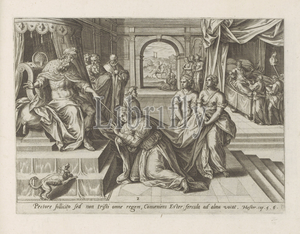 Ester, Ahasuerus History, series title, Historia Asuerij, Thesaurus sacrarum historiaru, m, veteris testame, n, ti, elega, tissimis imaginibus expressu, excelle, tissimoru, hac arte viroru, opera, now, c primu, luce, editus, Ester kneels, king Ahasuerus, king points, scepter, sign, affection, Esther invites, king, come, Haman, feast provided, right, background, continuation, story, evening, read aloud, chronicles, empire, states, Mordecai, thwarted, attack, life, king asks Haman, standing, bed, someone, saved, king should, honored, background you, see Mordecai riding, king's robe, king's horse, performance, reference, Latin, Bible text, Est, 5-6, Print, part, album, Ahasuerus holds out, Esther, Esther usually kneeling, Ahasuerus, sleepless, court records read, King Ahasuerus asks Haman, honor, man, wishes, reward, Mordecai's triumph, mounted, led, city, looking, palace, Hans Collaert, I, attributed, Antwerp, 1579, paper, engraving