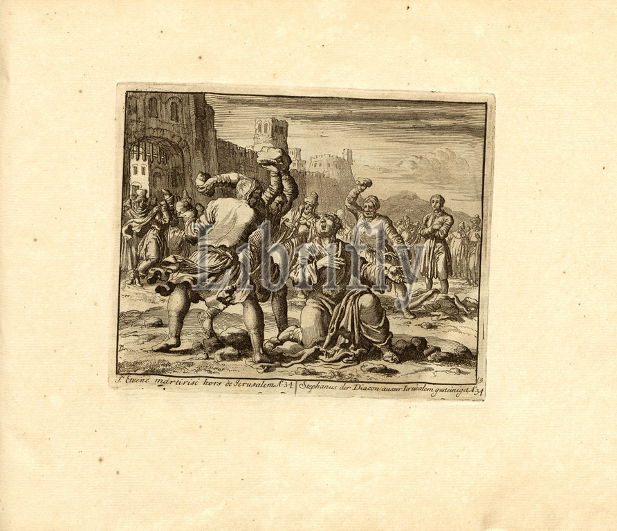S. Etiene martyred out of Jerusalem, Anno 34, Parallel title: Stephen of the Deacon apart from Jerusalem stoned, A nn o 34, copperplate engraving, 3.), p. 15, Luyken, Jan (inv. et fec.), Jan Luyken: Théâtre des martyrs: depuis la mort de J.Christ jusqu'à present: représenté en très belles tailles-douces = Schau-Bühne der Martyrer; gezeichnet und in Kuppfer gestochen. Leyde: chez Pierre Van der Aa, [1711]