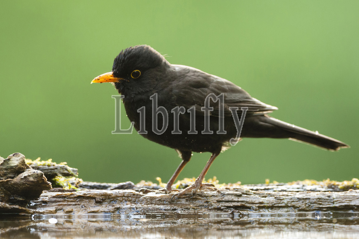 Eurasian Blackbird male standing at waterside, Hungary