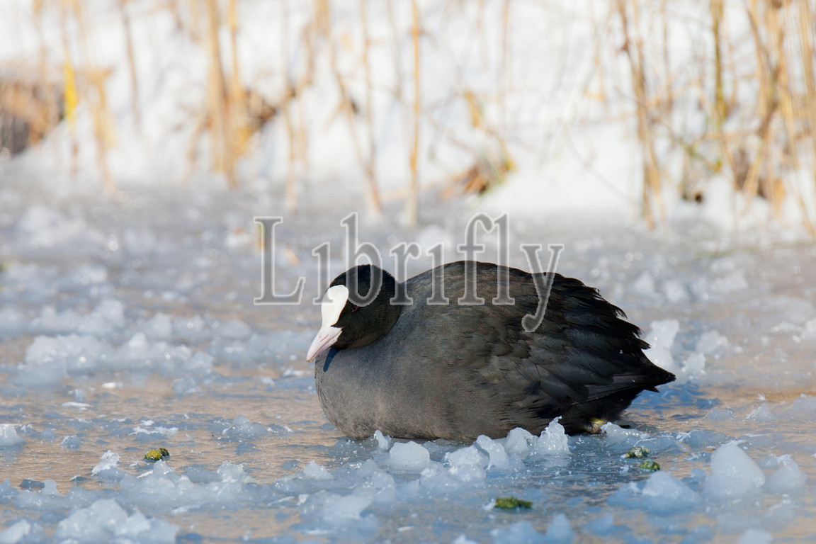 Eurasian Coot in winter on the ice, Fulica atra