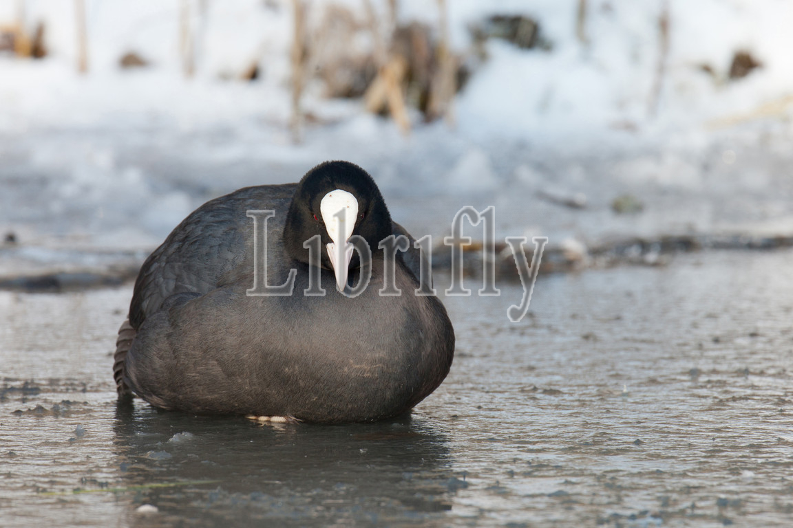 Eurasian Coot in winter on the ice, Fulica atra
