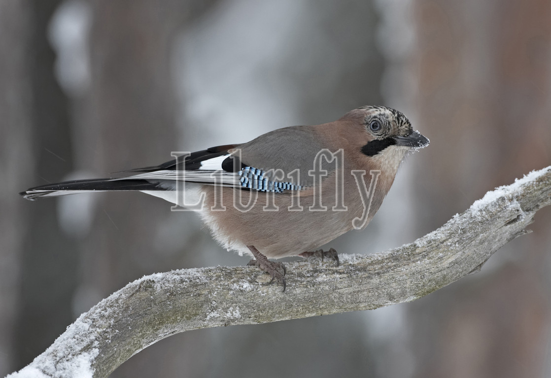 Eurasian Jay perched on a snow covered branch, Garrulus glandarius, Norway