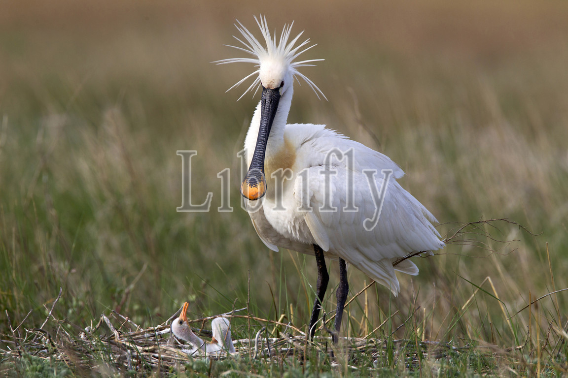 Eurasian Spoonbill on nest with chick, Platalea leucorodia
