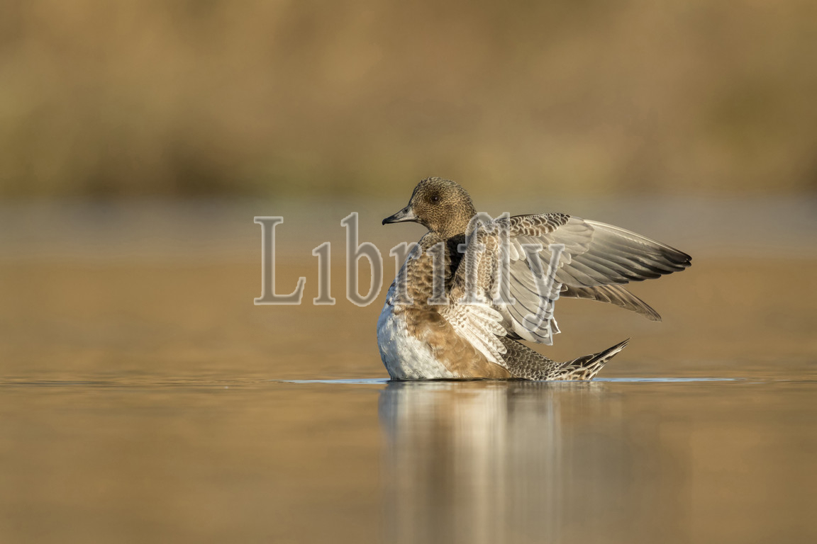 Eurasian Wigeon eclipse with open wings low point of view, Mareca penelope, Netherlands