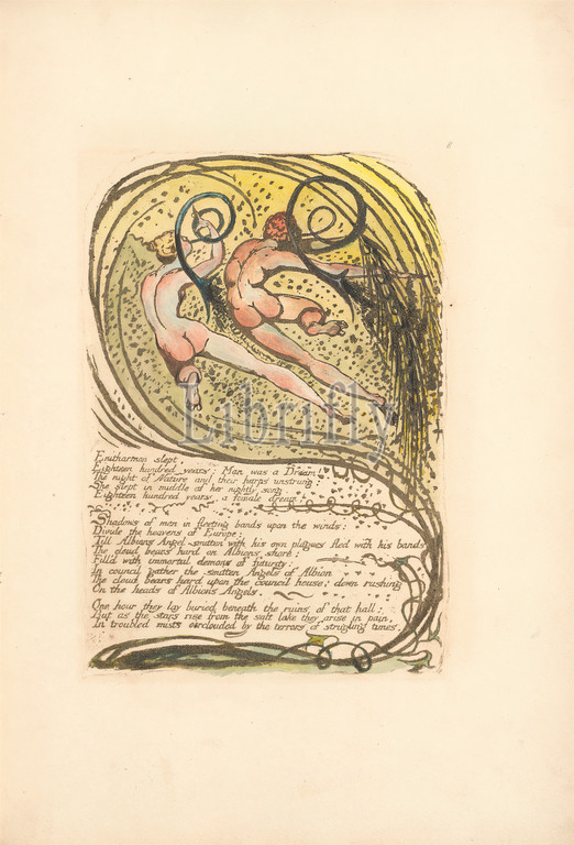 Europe. A Prophecy, Plate 10, 'Enitharmon slept . . . . ' (Bentley 12), Print made by William Blake, 1757–1827, British, 1794, Color-printed relief etching in dark brown with pen and black ink, oil and watercolor on moderately thick, slightly textured, cream wove paper, Sheet: 14 3/4 x 10 1/2 inches (37.5 x 26.7 cm), Plate: 9 1/4 x 6 3/4 inches (23.5 x 17.1 cm), and Spine: 15 3/8 inches (39.1 cm), branches, leaf, men, nudes, religious and mythological subject, text, vines, women