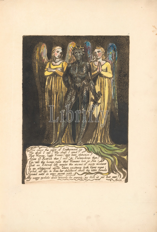 Europe. A Prophecy, Plate 7, 'Now comes the night . . . . ' (Bentley 8), Print made by William Blake, 1757–1827, British, 1794, Color-printed relief etching in dark brown with pen and black ink, oil and watercolor on moderately thick, slightly textured, cream wove paper, Sheet: 14 3/4 x 10 1/2 inches (37.5 x 26.7 cm), Plate: 9 3/8 x 6 3/4 inches (23.8 x 17.1 cm), and Spine: 15 3/8 inches (39.1 cm), angels, flames, literary theme, men, night, religious and mythological subject, scales, sword, text, wings, women